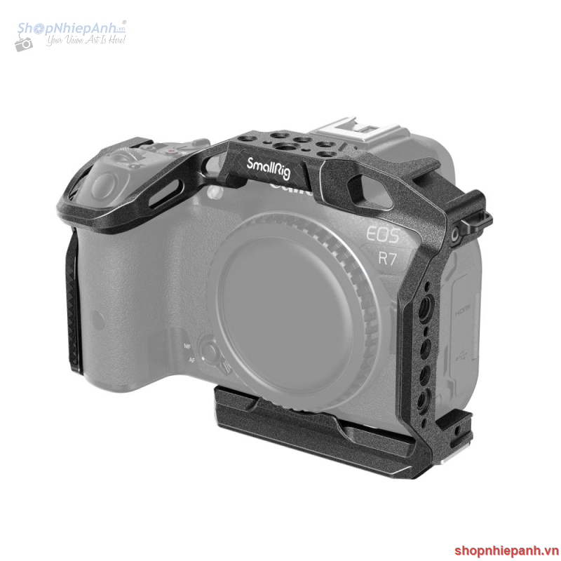 SmallRig “Black Mamba” Cage for Canon EOS R7 4003 is designed to provide protection and multiple accessory mounting points. Locking the camera via one 1/4 "-20 screw at the bottom and one side lock adapter on both sides, this cage features silicone cushions that prevent scratching and “Black Mamba” style as a whole that gives full access to all controls of the camera. It also comes with 1/4 "-20 threaded holes and ARRI 3/8" -16 locating holes for Side Handle 2093 and 3814, Top Handle 3786 and 3765, Magic Arm 2070, Monitor Mount 2903, Holder for Portable Power Banks 2336, Rod Clamp 3598, etc.; Cold shoe mounts for attaching the microphone and LED light; NATO rails for Side Handle 3260 and 3813; and strap slots for Hand Strap 3848 and Camera Shoulder Strap PSC2428. Arca-Swiss quick release plate at the bottom supports DJI RS 2 / RSC 2 stabilizer and Arca-Swiss tripod to allow quick switch among handheld, stabilizer, and tripod shooting scenes. The built-in QD socket on the bottom is available to attach the quick disconnect strap system. In addition, a double-ended wrench is included for easy disassembly.